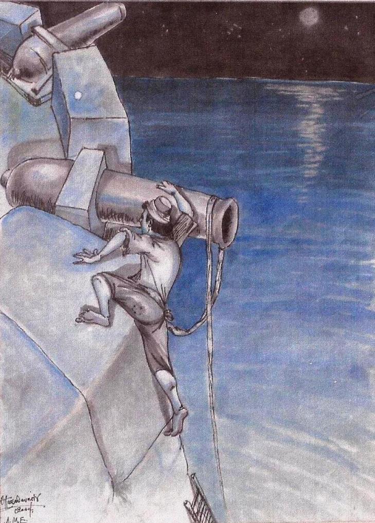 «Ο Μοσχονησιώτης ρίχνει τη σκάλα πάνω στα τείχη μα δεν έφτανε εις το ύψος τους. Τότε ο Σταμάτης Μήτσας, ένας νέος… ανεβαίνει εις το τελευταίο σκαλοπάτι, ρίχνει το ζωνάρι του σ’ ένα κανόνι και σκαρφαλώνει πάνω στο τείχος. Ύστερα βοηθεί το Μοσχονησιώτη να ανέβη και πηδάνε μαζί μέσα στα τείχη. Προχωρούν και διακρίνουν μέσα στο σκοτάδι λίγο φως. Ήταν το τούρκικο φυλάκιο. Μέσα ο Τούρκος φρουρός έτρωγε φύλλα φραγκοσυκιάς. Ο Μοσχονησιώτης ορμά, τον αφοπλίζει, τον φιμώνει και φωνάζει τους συντρόφους που έμειναν κάτω να αναρριχηθούν…».