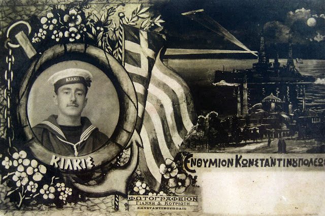Το φωτογραφείο «Γιάννη Δ. Κουριώτη – Κωνσταντινούπολις» έχει έτοιμο το μοντάζ της φωτογράφησης. Σε πρώτο πλάνο το σκίτσο της Αγιά Σοφιάς, στο βάθος αγκυροβολημένο το ελληνικό θωρηκτό ρίχνει τον προβολέα του και μέσα από το σημαιοστολισμένο σωσίβιο του «Κιλκίς» ο Κυριάκος Κούνες (νομίζω) ερμιονίτης φίλος του πατέρα μου, που υπηρετούσε σ αυτό.