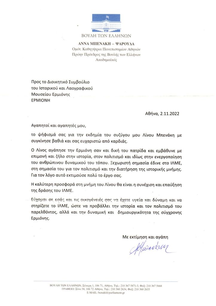 - Να εκφράσει τα ειλικρινή συλλυπητήριά του στην αγαπητή σύζυγό του κα Άννα Ψαρούδα Μπενάκη.