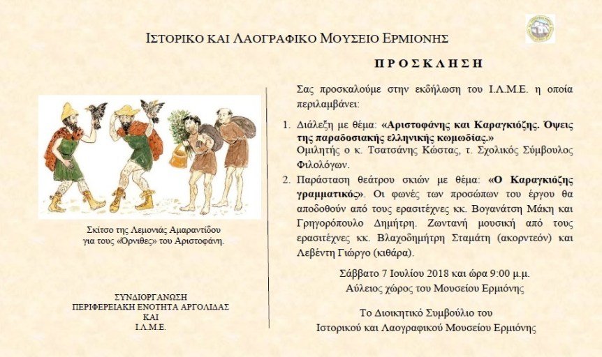 Το Σάββατο 7 Ιουλίου 2018 πραγματοποιήθηκε στην κατάμεστη αυλή του Μουσείου, η εκδήλωση του ΙΛΜΕ με θέμα «Αριστοφάνης και Καραγκιόζης». Η εκδήλωση ήταν ενταγμένη στο φεστιβάλ «Δρόμοι Πολιτισμού Αργολίδας 2018» της Περιφερειακής Ενότητας Αργολίδας.