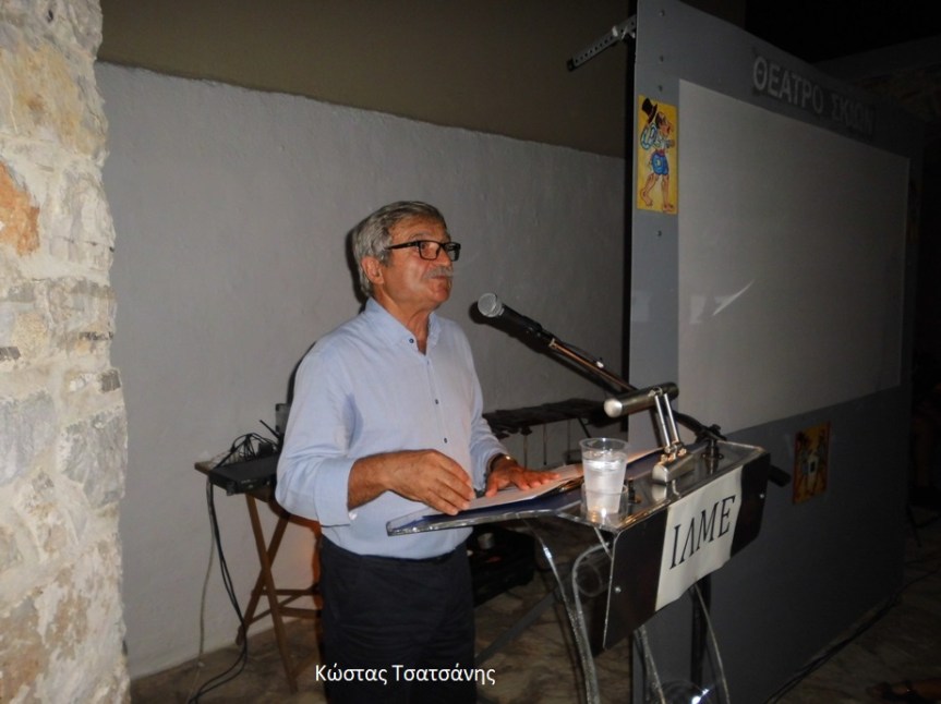 Στο πρώτο μέρος της εκδήλωσης ο Κώστας Τσατσάνης, τ. Σχολικός Σύμβουλος Φιλολόγων, πραγματοποίησε ομιλία με θέμα «Αριστοφάνης και Καραγκιόζης. Όψεις της παραδοσιακής ελληνικής κωμωδίας».