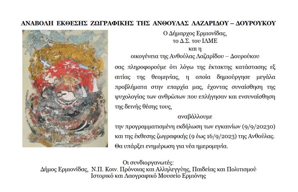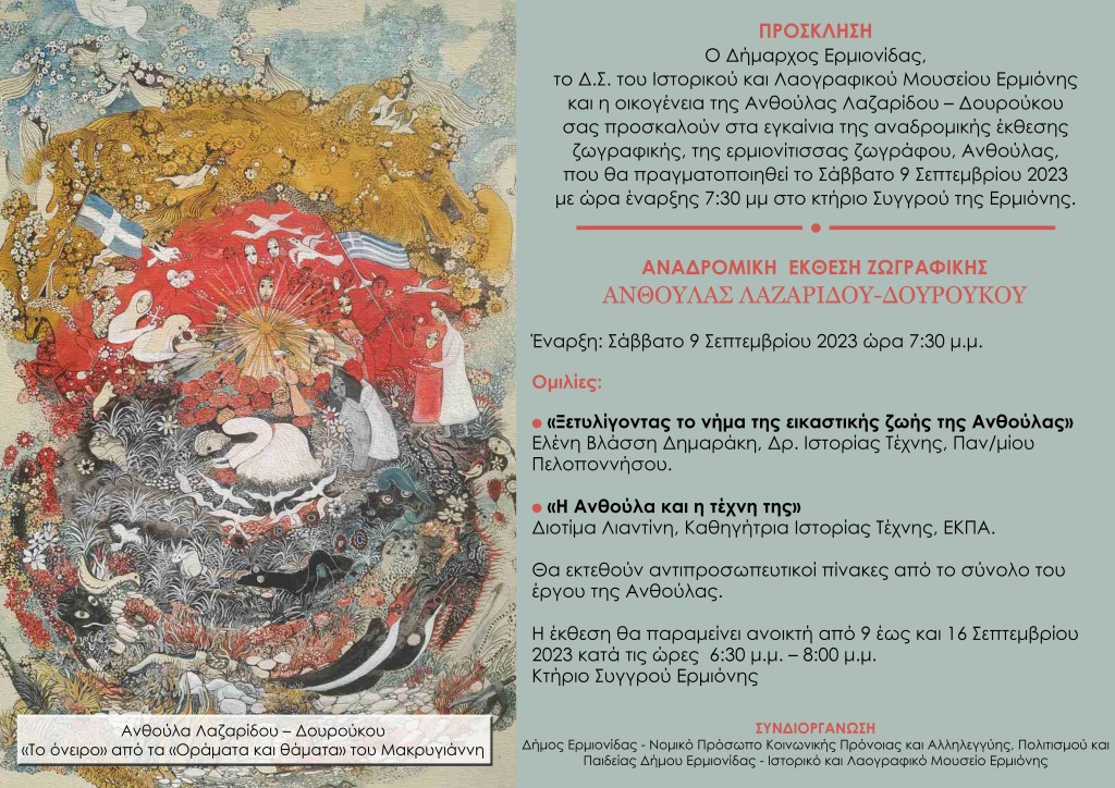 Ολοκληρώθηκε την Κυριακή 11/8/2024 η έκθεση ζωγραφικής με έργα της αείμνηστης ερμιονίτισσας ζωγράφου Ανθούλας Λαζαρίδου – Δουρούκου, που συνδιοργάνωσαν το ΙΛΜΕ, ο Δήμος Ερμιονίδας και η Δημοτική Κοινότητα Ερμιόνης με την συνεργασία της οικογένειας Δουρούκου, η οποία έκθεση φιλοξενήθηκε στο Πνευματικό Κέντρο Ερμιόνης (Συγγρού).