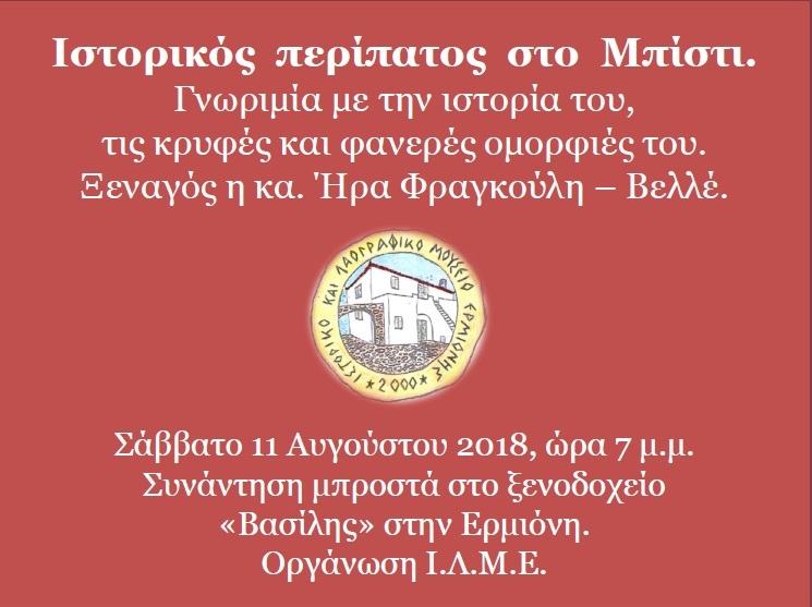 Ο δεύτερος ιστορικός περίπατος στο Μπίστι, που έχει προγραμματιστεί για το Σάββατο 11 Αυγούστου 2018 και ώρα 19:00 θα πραγματοποιηθεί κανονικά με σημείο συνάντησης μπροστά από το ξενοδοχείο «Βασίλης» στην Ερμιόνη, με ξεναγό την κα Ήρα Φραγκούλη.